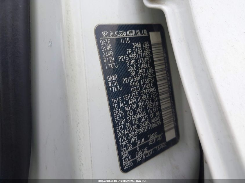 Колір БілийЦиліндри 4Привід Передній привідVIN JN8AF5MR2FT508295Стан СтаціонарноУшкодження Пожежа двигунаДата аукціону 2025-12-08 AutoRIA