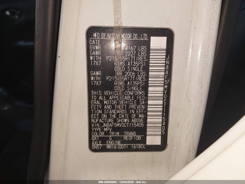 Колір БілийЦиліндри 4Привід Повний привідVIN JN8AF5MV0CT115405Стан Заводиться та їде (перевірено)Ушкодження Передня або задня AutoRIA