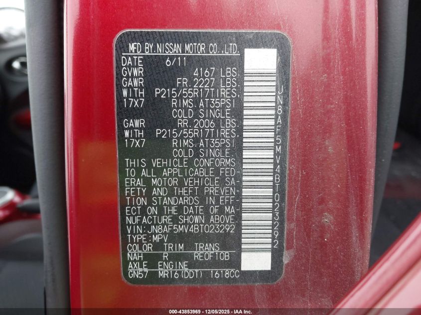 2011 NISSAN JUKE 2011 року Бензин, 1.6, Повний привід, vin - JN8AF5MV4BT023292 з США