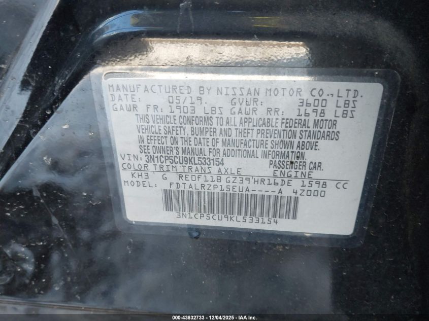 2019 NISSAN KICKS 2019 року Бензин, 1.6, Передній привід, vin - 3N1CP5CU9KL533154 з США