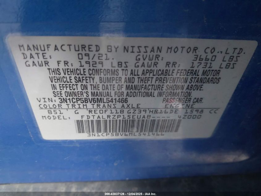 2021 NISSAN KICKS 2021 року Бензин, 1.6, Передній привід, vin - 3N1CP5BV6ML541466 з США