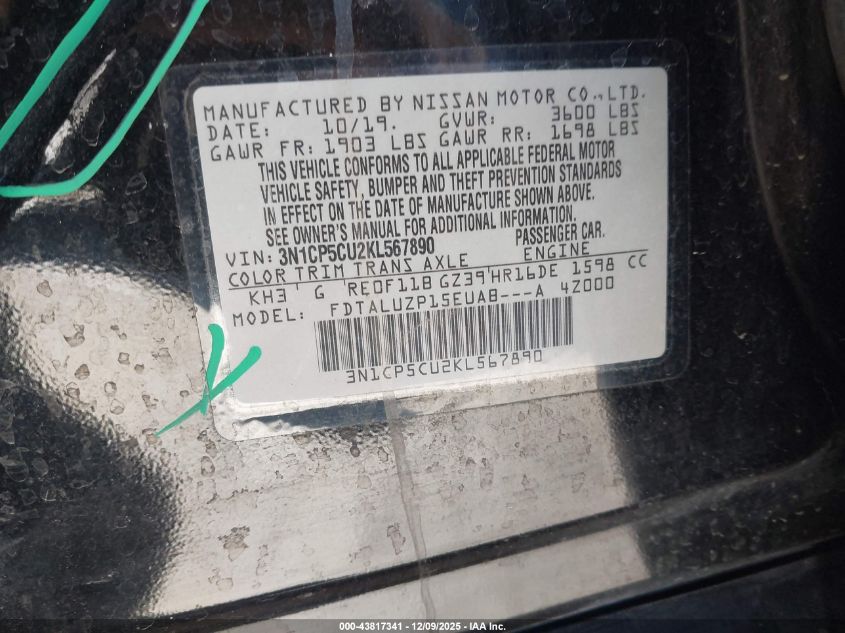 2019 NISSAN KICKS 2019 року Бензин, 1.6, Передній привід, vin - 3N1CP5CU2KL567890 з США