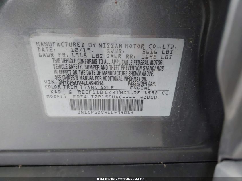 2020 NISSAN KICKS 2020 року Бензин, 1.6, Передній привід, vin - 3N1CP5DV4LL494014 з США