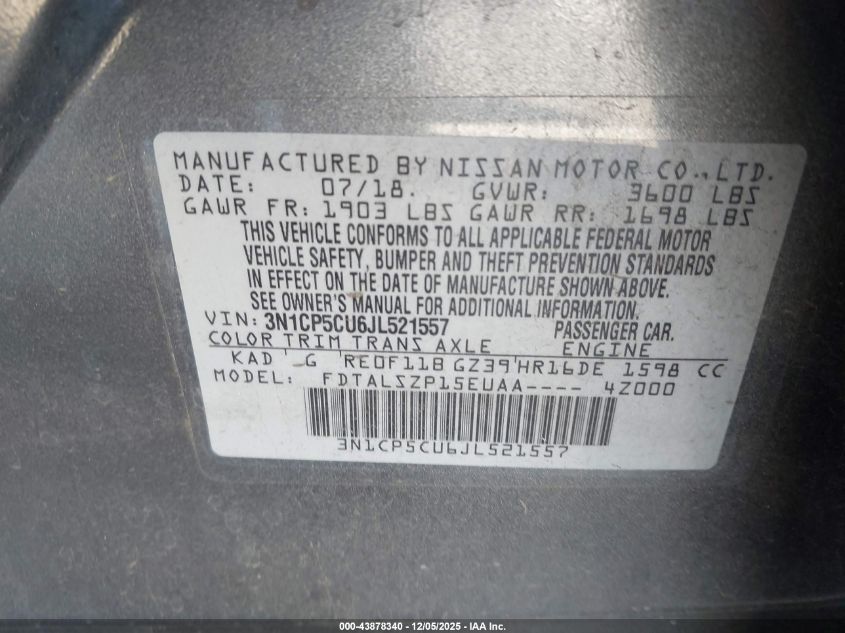 2018 NISSAN KICKS 2018 року Бензин, 1.6, Передній привід, vin - 3N1CP5CU6JL521557 з США