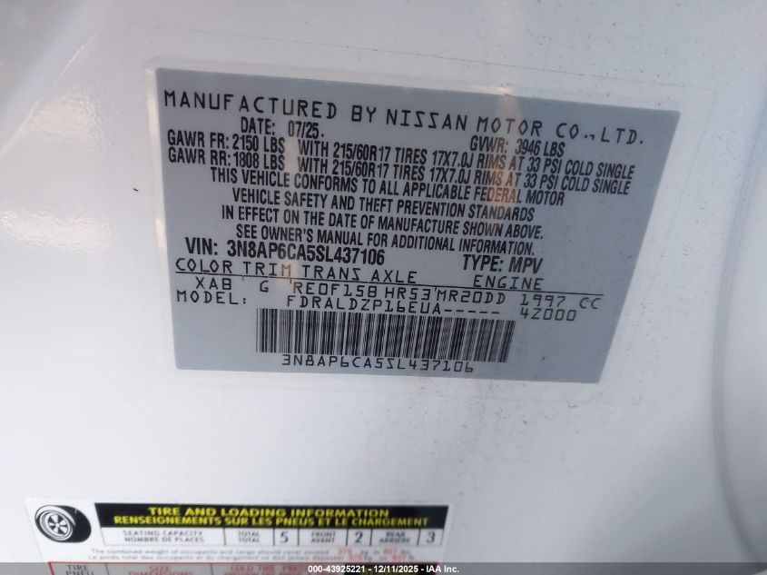 2025 NISSAN KICKS 2025 року Бензин, 2.0, Передній привід, vin - 3N8AP6CA5SL437106 з США