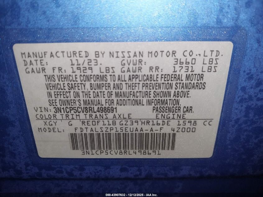 2024 NISSAN KICKS 2024 року Бензин, 1.6, Передній привід, vin - 3N1CP5CV8RL498691 з США