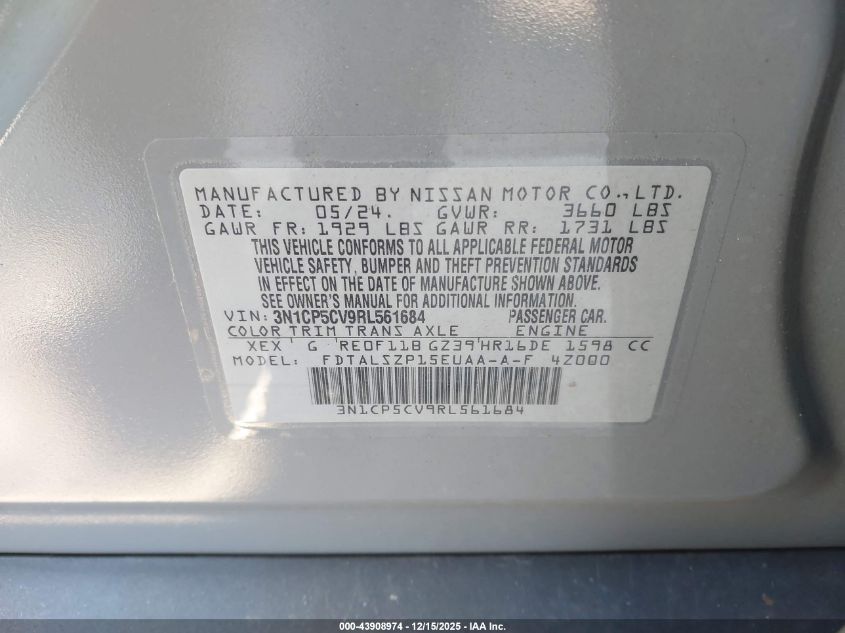 2024 NISSAN KICKS 2024 року Бензин, 1.6, Передній привід, vin - 3N1CP5CV9RL561684 з США