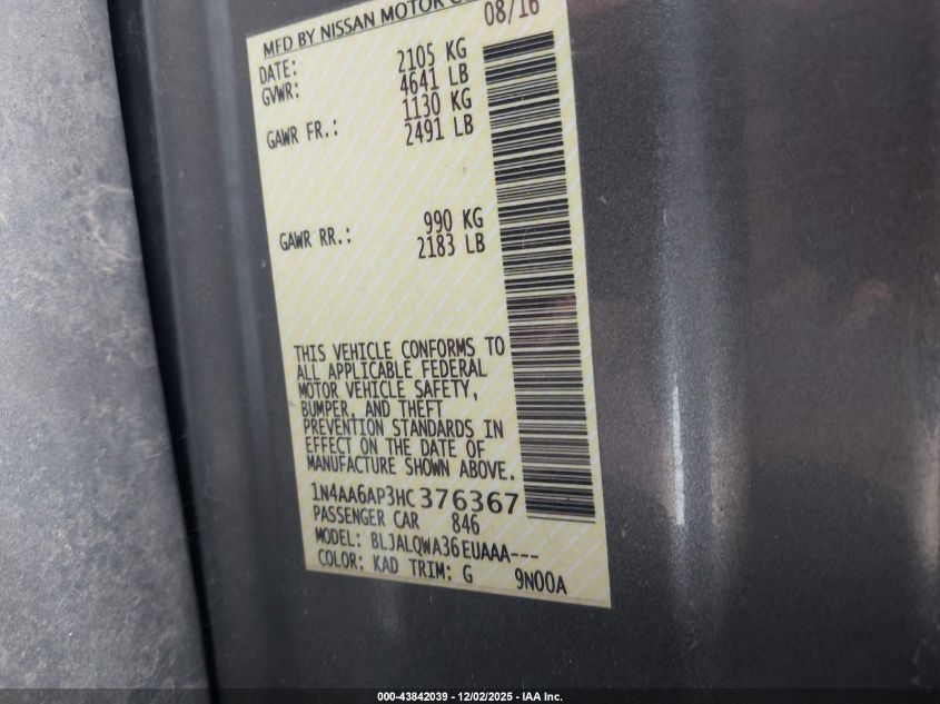 2017 NISSAN MAXIMA 2017 року Бензин, 3.5, Передній привід, vin - 1N4AA6AP3HC376367 з США