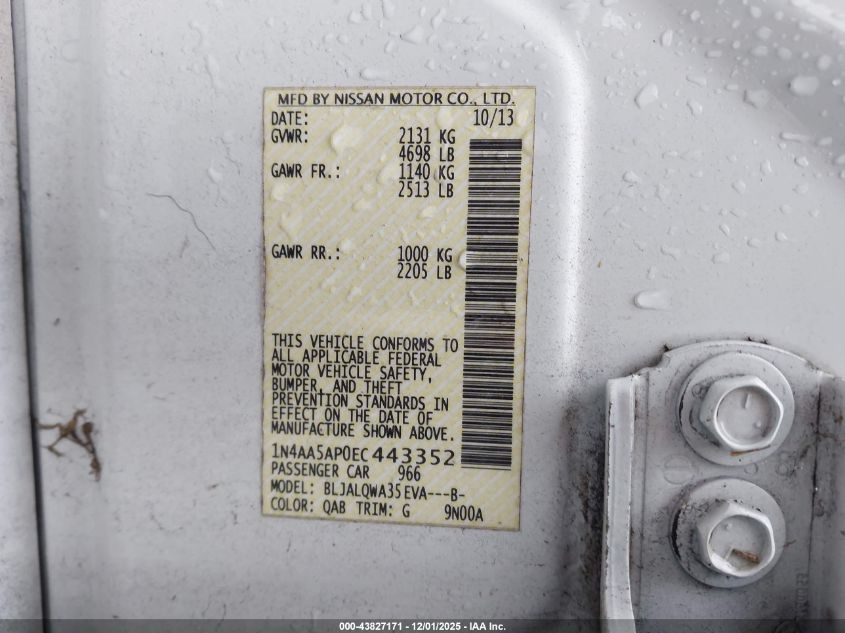 Колір БілийЦиліндри 6Привід Передній привідVIN 1N4AA5AP0EC443352Стан СтаціонарноУшкодження Звичайний знос AutoRIA