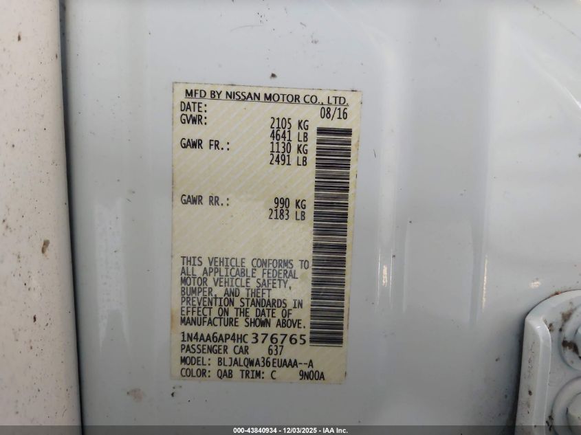 Колір БілийЦиліндри 6Привід Передній привідVIN 1N4AA6AP4HC376765Стан Заводиться та їде (перевірено)Ушкодження Передня або задня AutoRIA