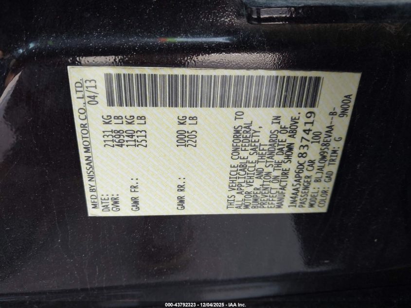 Колір ЧорнийЦиліндри 6Привід Передній привідVIN 1N4AA5AP6DC837419Стан СтаціонарноУшкодження Передня або задня AutoRIA