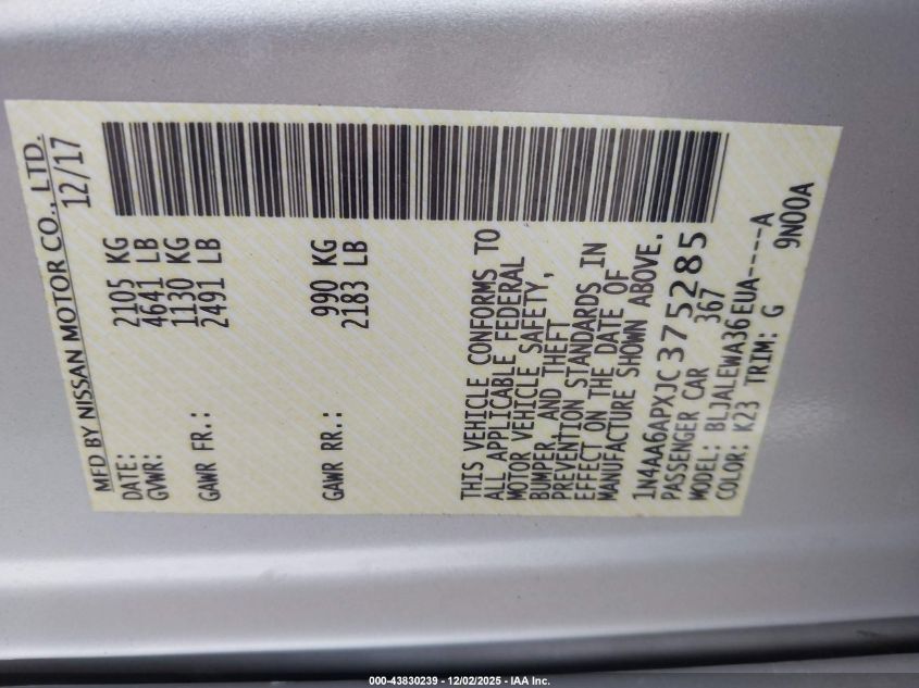 Колір СрібнийЦиліндри 6Привід Передній привідVIN 1N4AA6APXJC375285Стан Заводиться та їде (перевірено)Ушкодження Передня або задня AutoRIA