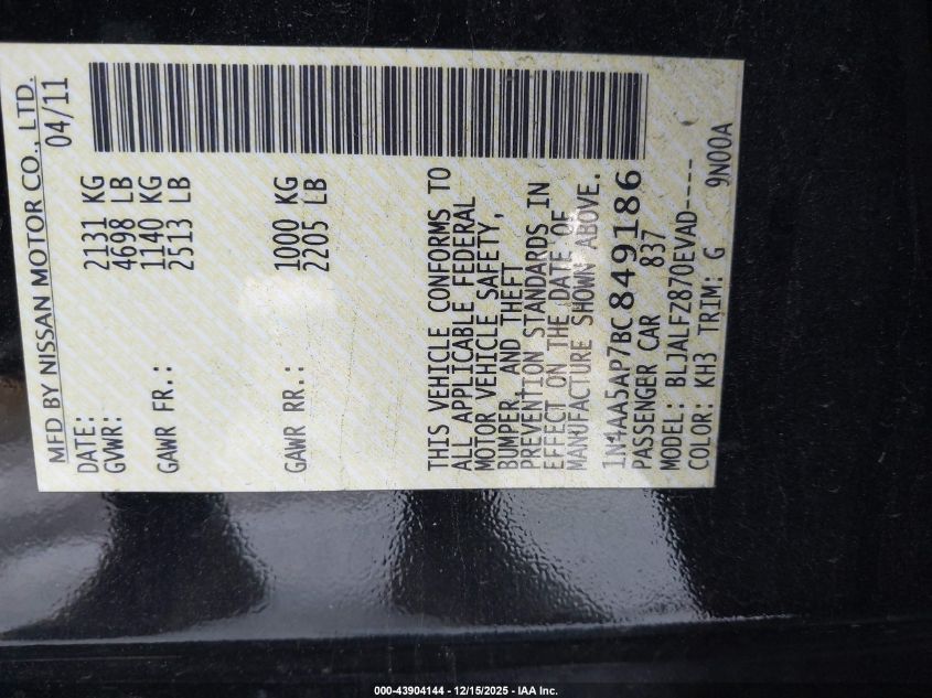 Колір ЧорнийЦиліндри 6Привід Передній привідVIN 1N4AA5AP7BC849186Стан Заводиться та їде (перевірено)Ушкодження Передня або задня AutoRIA