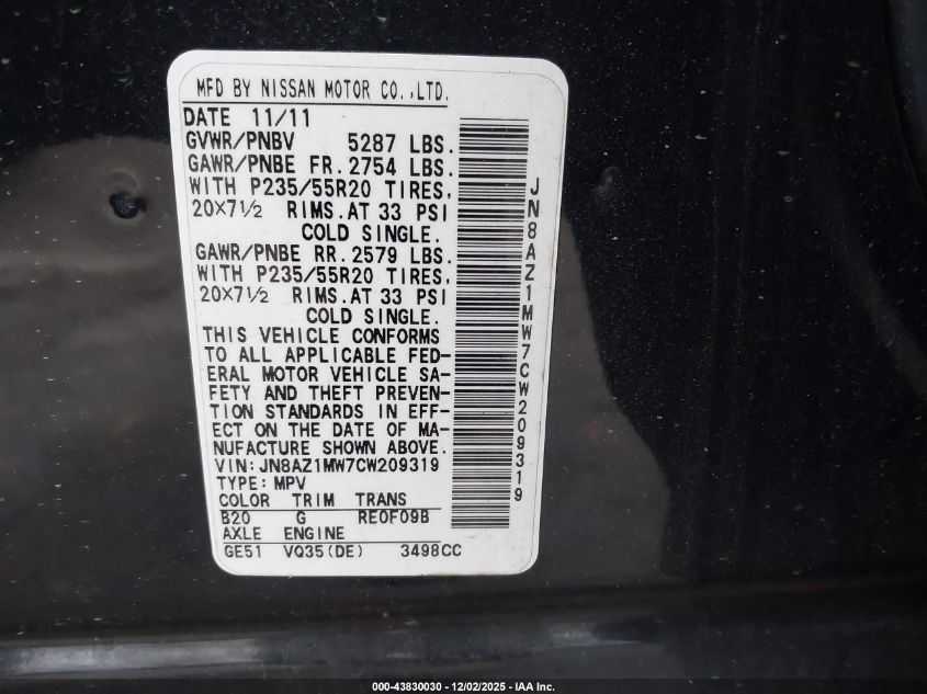 Колір ЧорнийЦиліндри 6Привід Повний привідVIN JN8AZ1MW7CW209319Стан Заводиться та їде (перевірено)Ушкодження Задня AutoRIA