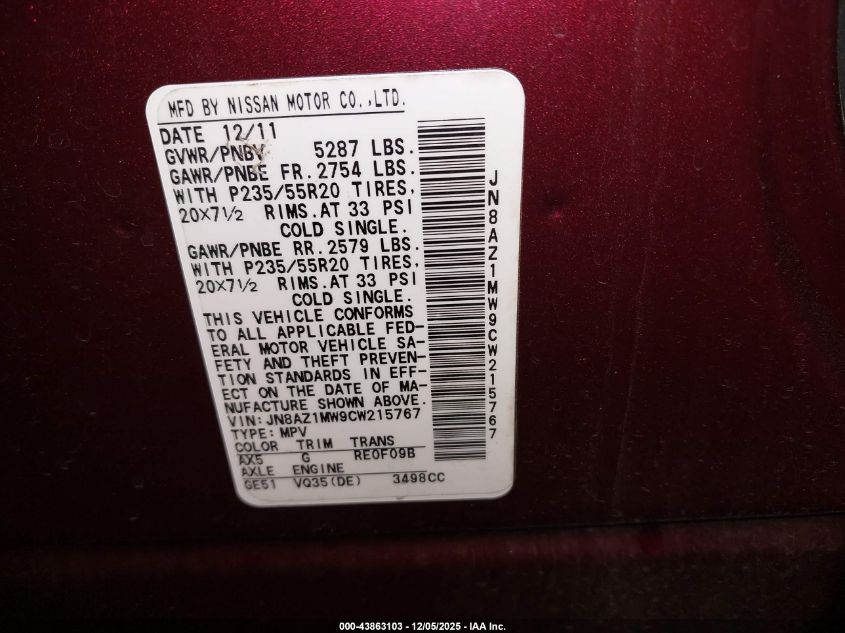 2012 NISSAN MURANO 2012 року Бензин, 3.5, Повний привід, vin - JN8AZ1MW9CW215767 з США