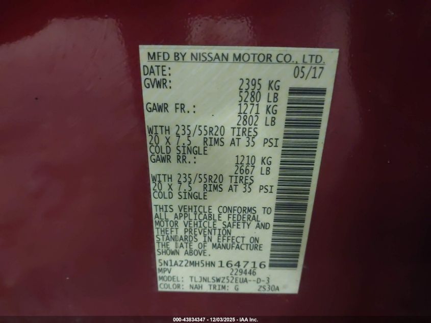 2017 NISSAN MURANO 2017 року Бензин, 3.5, Повний привід, vin - 5N1AZ2MH5HN164716 з США