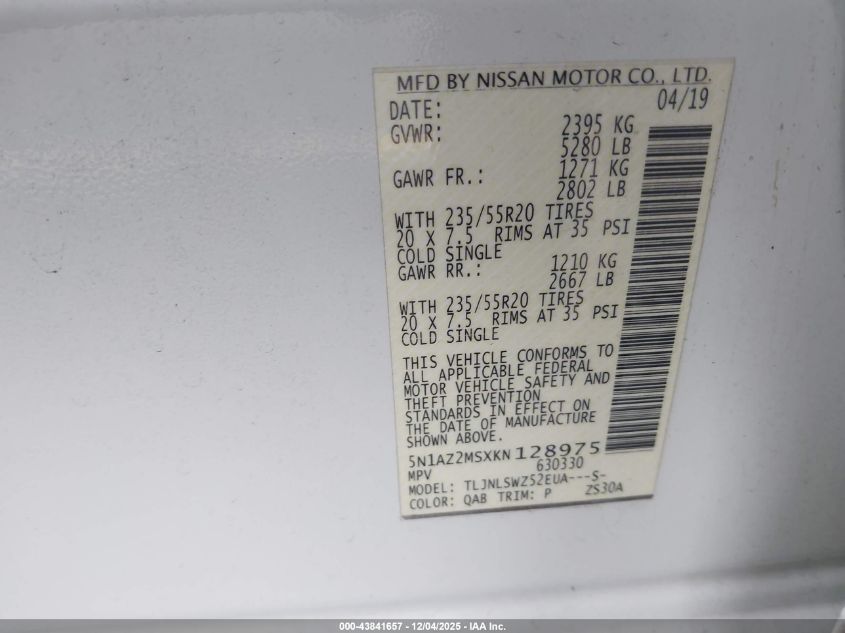2019 NISSAN MURANO 2019 року Бензин, 3.5, Повний привід, vin - 5N1AZ2MSXKN128975 з США