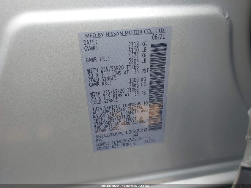 2021 NISSAN MURANO 2021 року Бензин, 3.5, Передній привід, vin - 5N1AZ2DJ9MC139228 з США