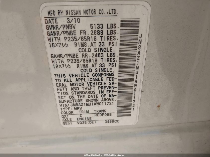 Колір БілийЦиліндри 6Привід Передній привідVIN JN8AZ1MU1AW011721Стан Заводиться та їде (перевірено)Ушкодження Передня або задня AutoRIA