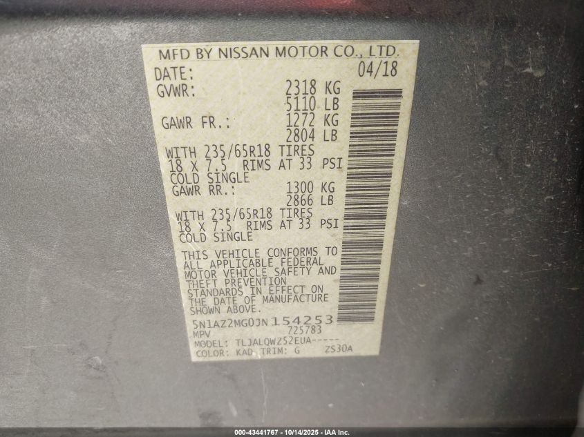 2018 NISSAN MURANO 2018 року Бензин, 3.5, Передній привід, vin - 5N1AZ2MG0JN154253 з США