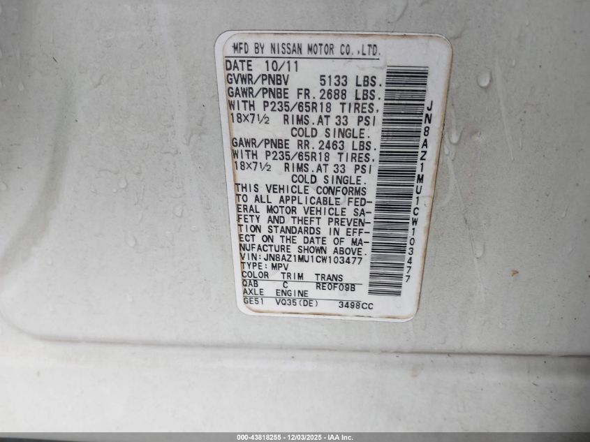 Колір БілийЦиліндри 6Привід Передній привідVIN JN8AZ1MU1CW103477Стан Заводиться та їде (перевірено)Ушкодження Передня або задня AutoRIA