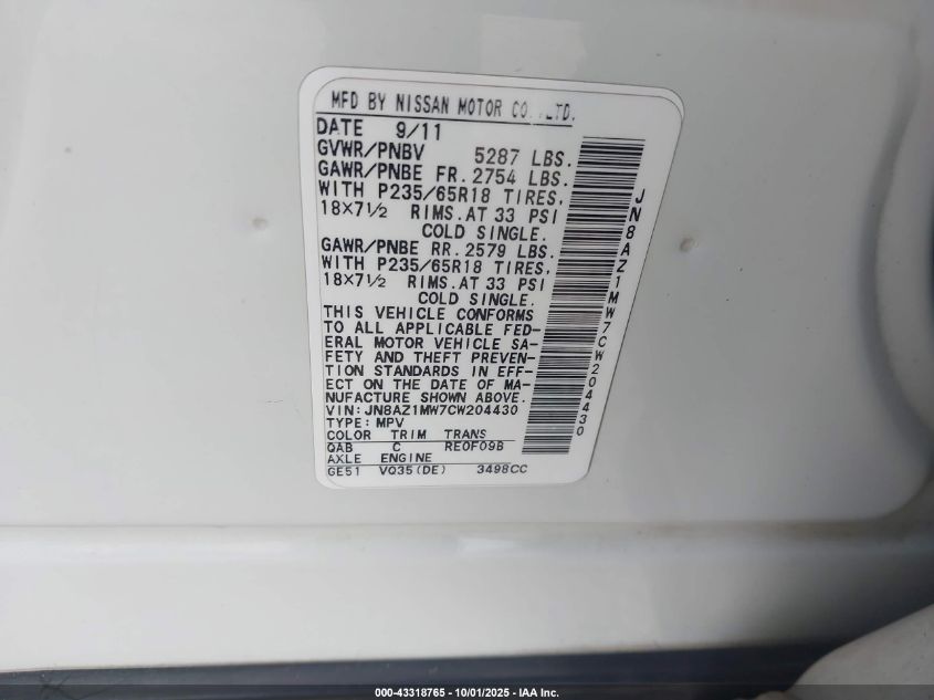 Колір Циліндри 6Привід Повний привідVIN JN8AZ1MW7CW204430Стан ЗаводитьсяУшкодження Права сторонаДата аукціону 2025-12-09 AutoRIA