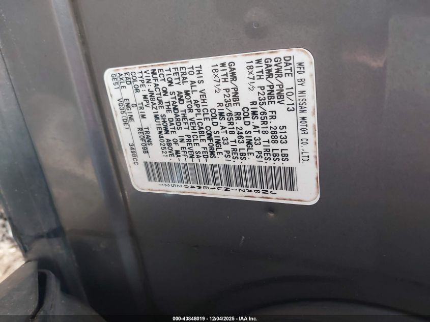 2014 NISSAN MURANO 2014 року Бензин, 3.5, Передній привід, vin - JN8AZ1MU1EW402521 з США