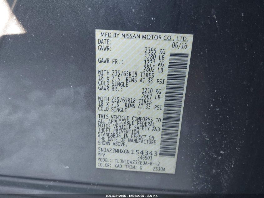 2016 NISSAN MURANO 2016 року Бензин, 3.5, Повний привід, vin - 5N1AZ2MHXGN154343 з США