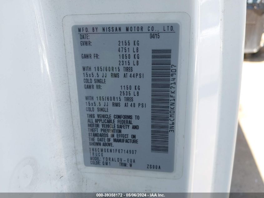 2015 NISSAN NV200 2015 року Бензин, 2.0, Передній привід, vin - 3N6CM0KN1FK714907 з США