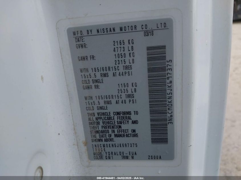 Колір БілийЦиліндри 4Привід Передній привідVIN 3N6CM0KN5JK697375Стан СтаціонарноУшкодження Перекидання AutoRIA