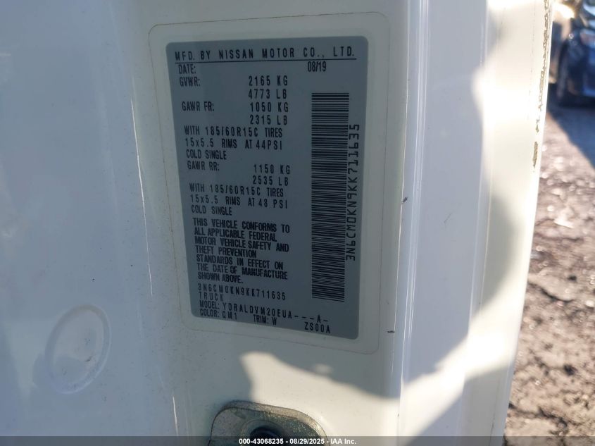 2019 NISSAN NV200 2019 року Бензин, 2.0, Передній привід, vin - 3N6CM0KN9KK711635 з США