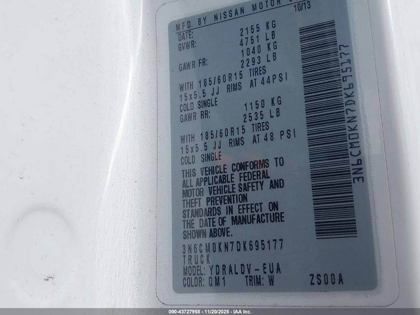 2013 NISSAN NV200 2013 року Бензин, 2.0, Передній привід, vin - 3N6CM0KN7DK695177 з США