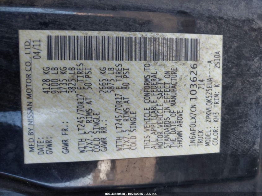 2012 NISSAN NV2500 2012 року Бензин, 5.6, Задній привід, vin - 1N6AF0LX7CN103626 з США