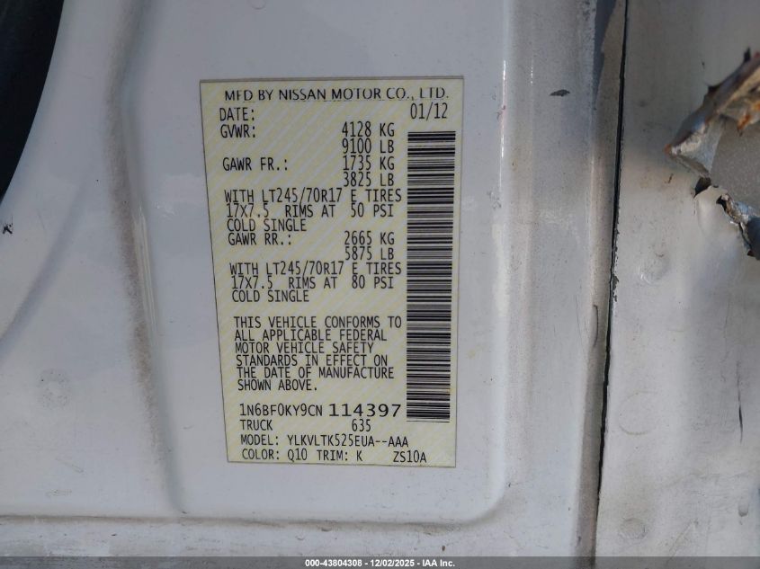 2012 NISSAN NV2500 2012 року Бензин, 4.0, Задній привід, vin - 1N6BF0KY9CN114397 з США
