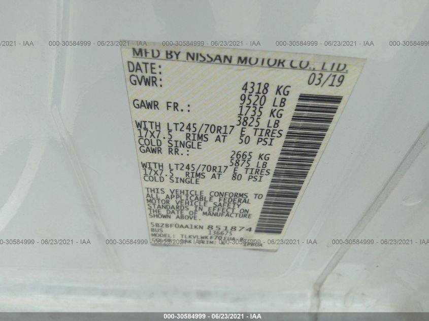 2019 NISSAN NV3500 2019 року Бензин, 4.0, Задній привід, vin - 5BZBF0AA1KN851874 з США
