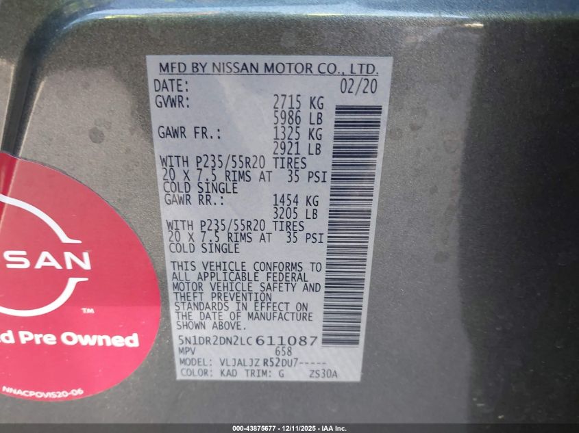 2020 NISSAN PATHFINDER 2020 року Бензин, 3.5, Передній привід, vin - 5N1DR2DN2LC611087 з США