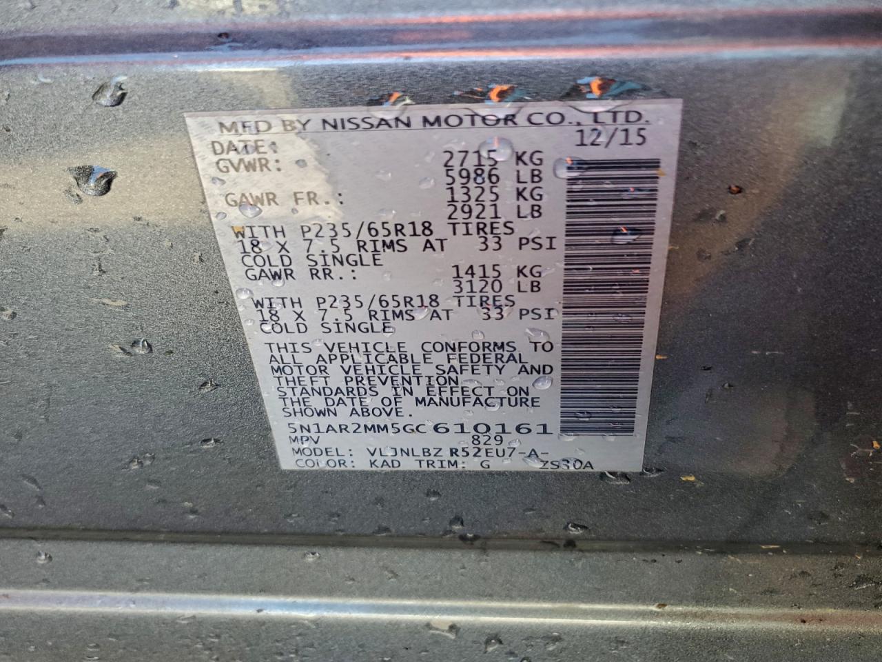 Колір СірийЦиліндри 6Привід 4x4 з переднім приводомVIN 5N1AR2MM5GC610161Стан Заводиться та їде (перевірено)Ушкодження Звичайний зносДата аукціону 2025-12-09 AutoRIA