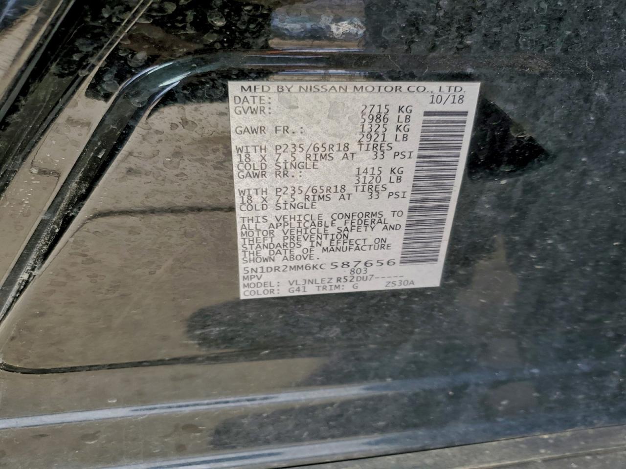 Колір ЧорнийЦиліндри 6Привід 4x4 з переднім приводомVIN 5N1DR2MM6KC587656Стан Заводиться та їде (перевірено)Ушкодження Передня або задня AutoRIA