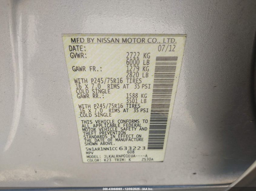 2012 NISSAN PATHFINDER 2012 року Бензин, 4.0, , vin - 5N1AR1NN1CC633223 з США