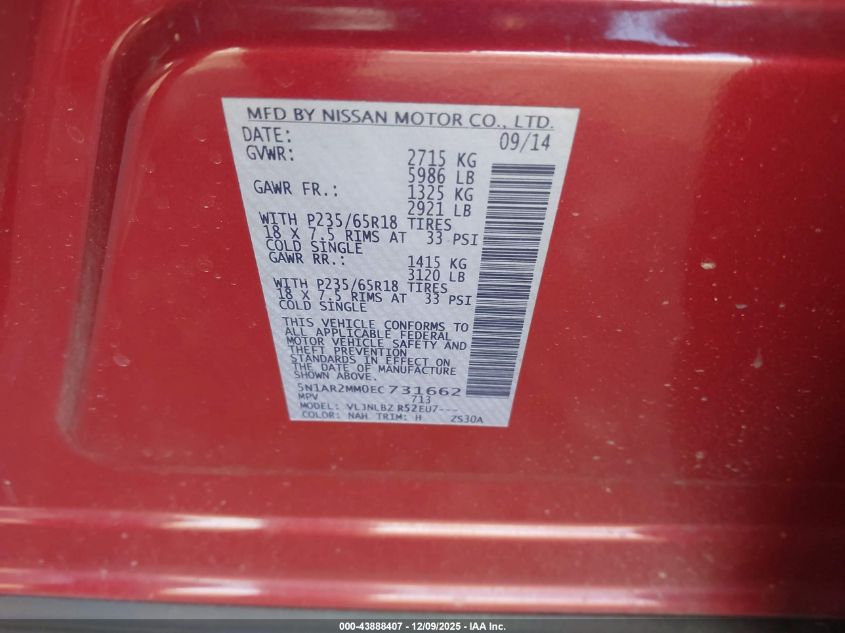 Колір ЧервонийЦиліндри 6Привід Повний привідVIN 5N1AR2MM0EC731662Стан Заводиться та їде (перевірено)Ушкодження Звичайний зносДата аукціону 2025-12-12 AutoRIA