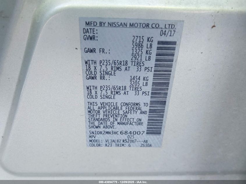 2017 NISSAN PATHFINDER 2017 року Бензин, 3.5, Передній привід, vin - 5N1DR2MN3HC684007 з США