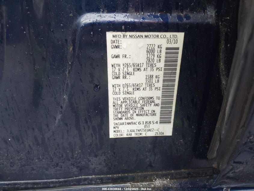 2010 NISSAN PATHFINDER 2010 року Бензин, 4.0, , vin - 5N1AR1NN9AC618854 з США