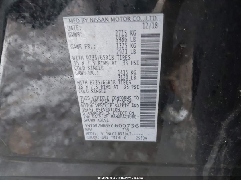 2019 NISSAN PATHFINDER 2019 року Бензин, 3.5, Повний привід, vin - 5N1DR2MM5KC600736 з США