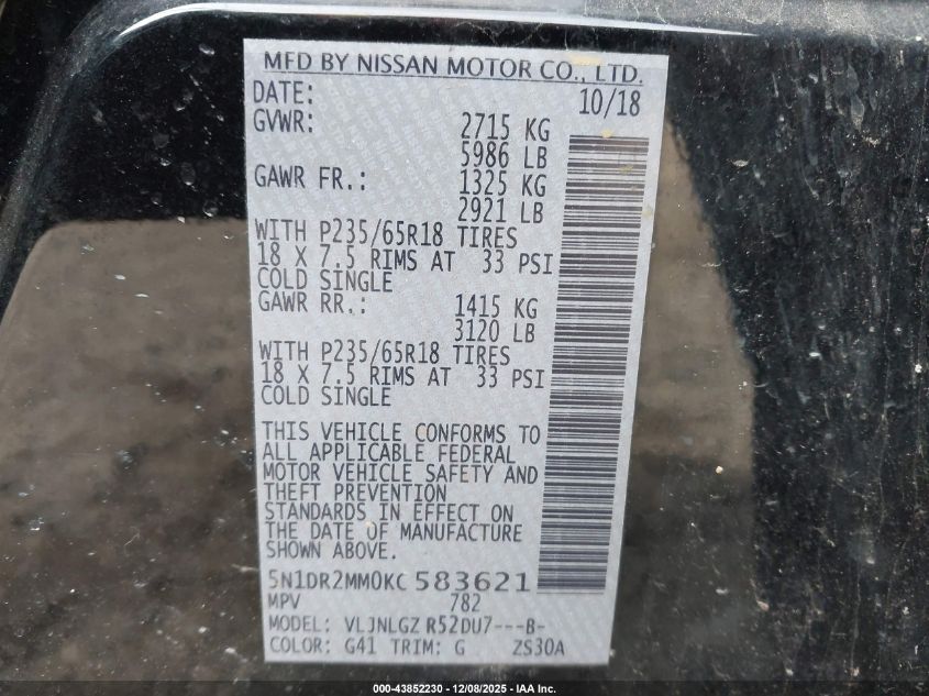 2019 NISSAN PATHFINDER 2019 року Бензин, 3.5, Повний привід, vin - 5N1DR2MM0KC583621 з США