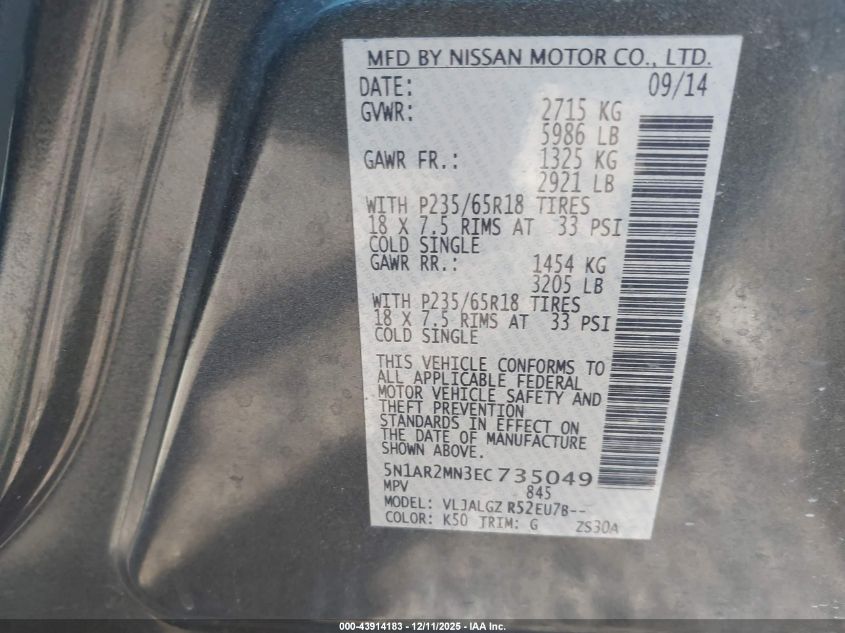 2014 NISSAN PATHFINDER 2014 року Бензин, 3.5, Передній привід, vin - 5N1AR2MN3EC735049 з США