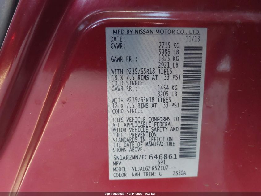 2014 NISSAN PATHFINDER 2014 року Бензин, 3.5, Передній привід, vin - 5N1AR2MN7EC646861 з США