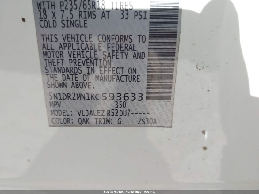 2019 NISSAN PATHFINDER 2019 року Бензин, 3.5, Передній привід, vin - 5N1DR2MN1KC593633 з США