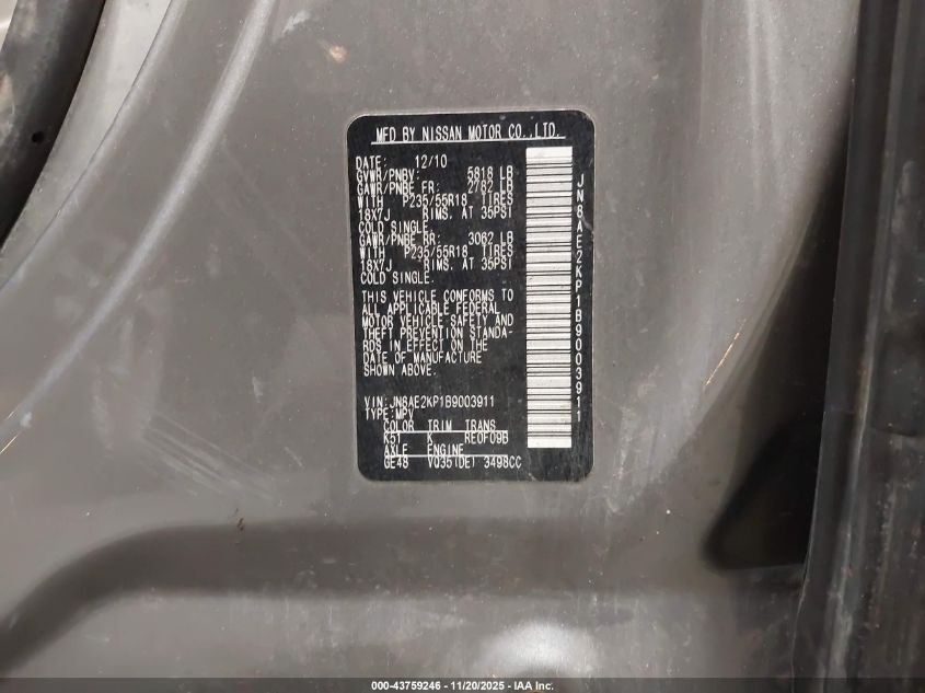 Колір СірийЦиліндри 6Привід Передній привідVIN JN8AE2KP1B9003911Стан Заводиться та їде (перевірено)Ушкодження Звичайний зносДата аукціону 2025-12-11 AutoRIA