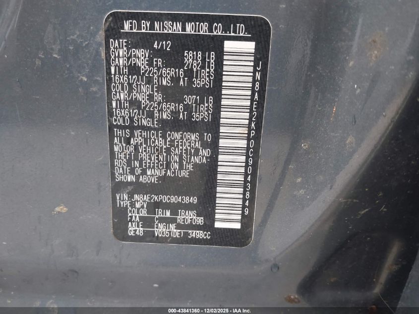 2012 NISSAN QUEST 2012 року Бензин, 3.5, Передній привід, vin - JN8AE2KP0C9043849 з США