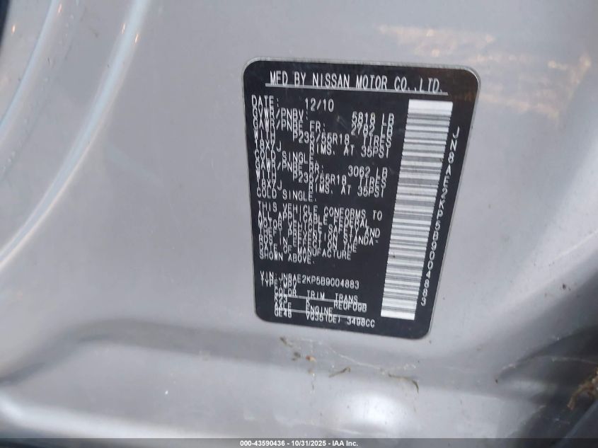 Колір СрібнийЦиліндри 6Привід Передній привідVIN JN8AE2KP5B9004883Стан Заводиться та їде (перевірено)Ушкодження Передня і задня Дата аукціону 2025-12-09 AutoRIA